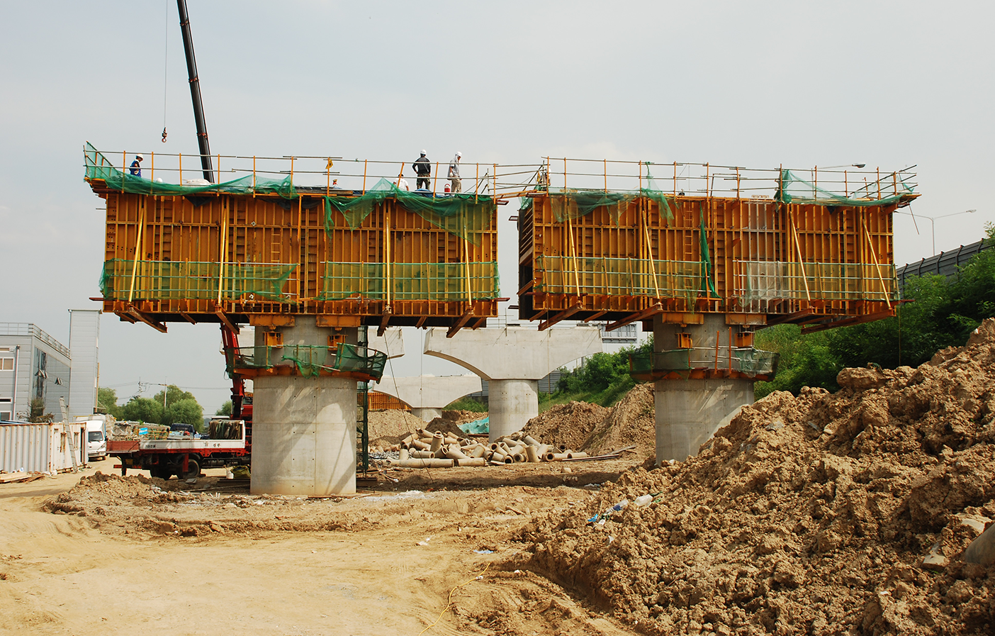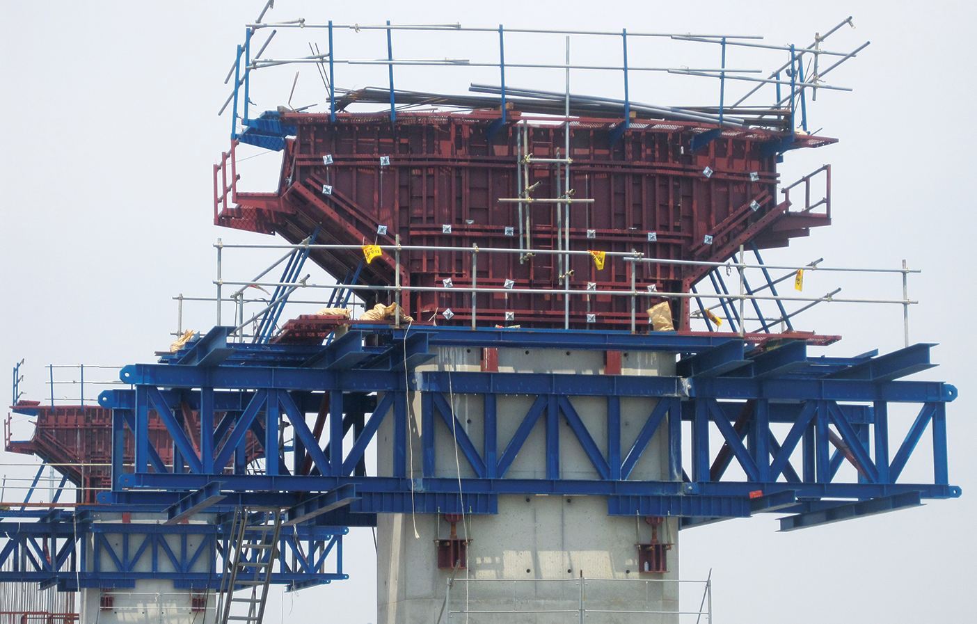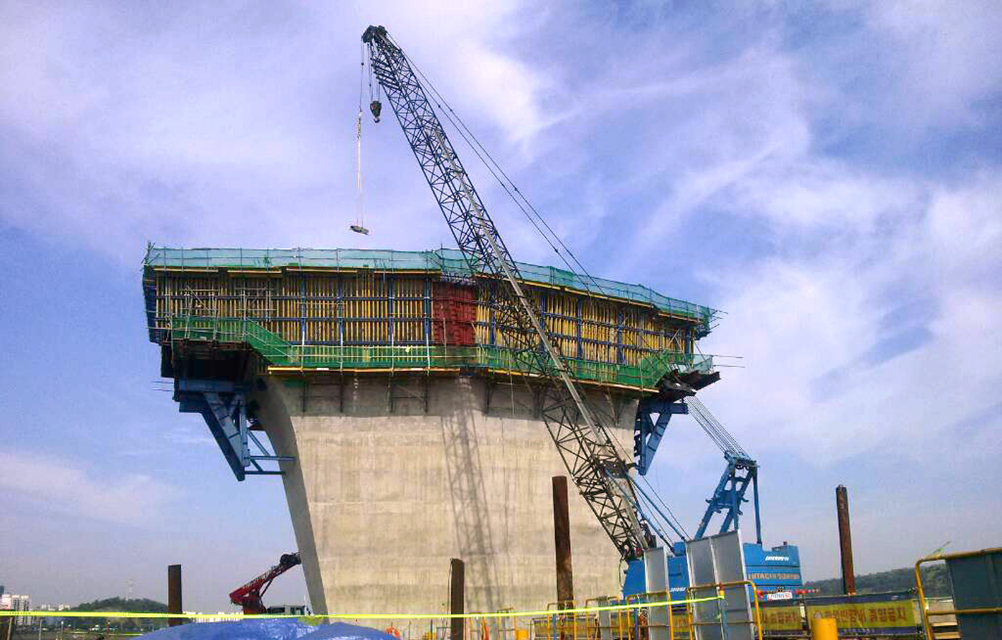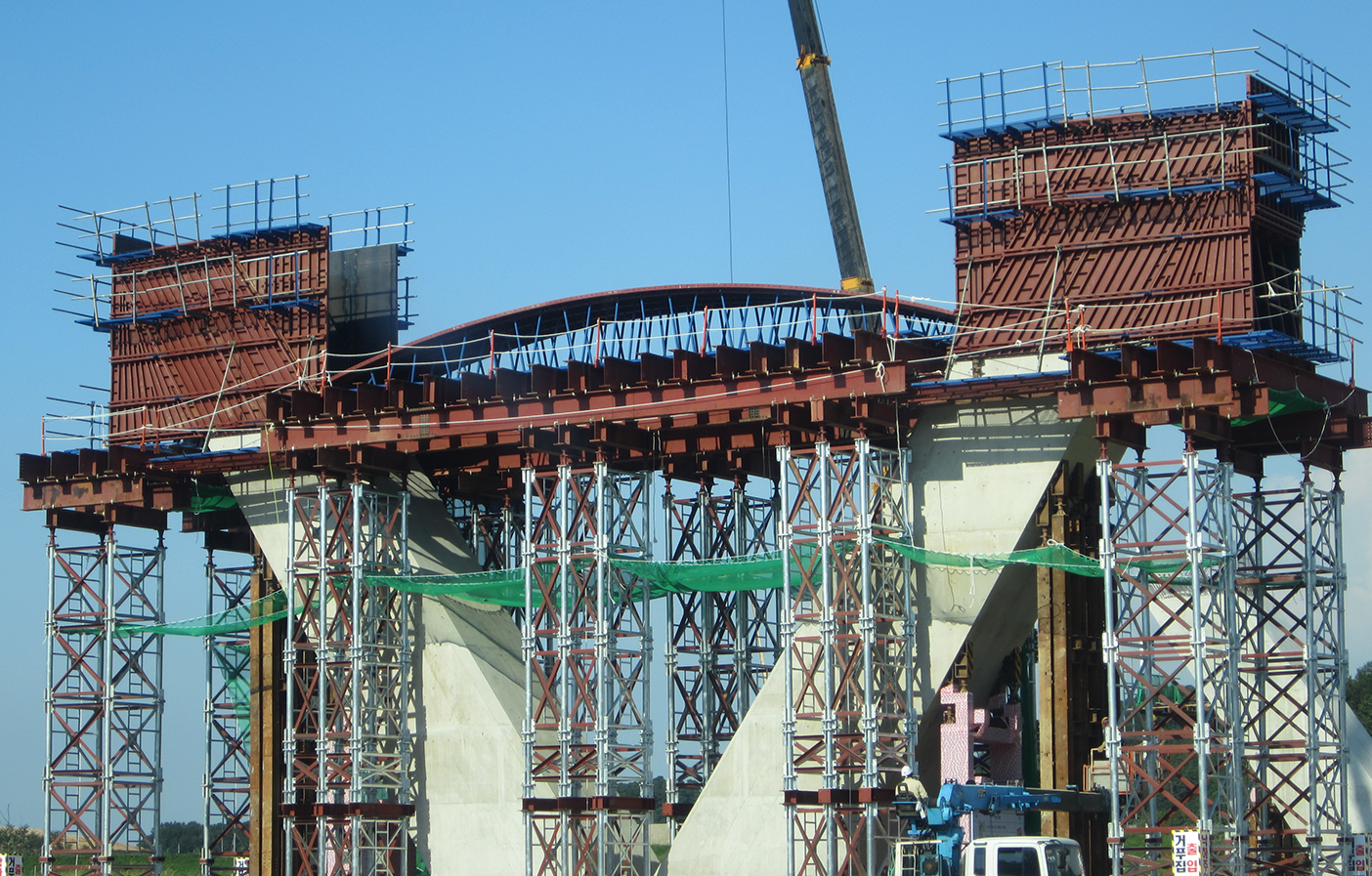 Plate girder system, one of Kumkang Kind’s coping system is used to build coping by installing anchor bracket on top of the pier and while the formwork stiffeners shall take the concrete load. This makes assembly, installation and dismantlement of the formwork easier than the traditional method (support method) which results in efficient construction while minimizing the cycle time. Moreover, it can be applied in higher bridges.