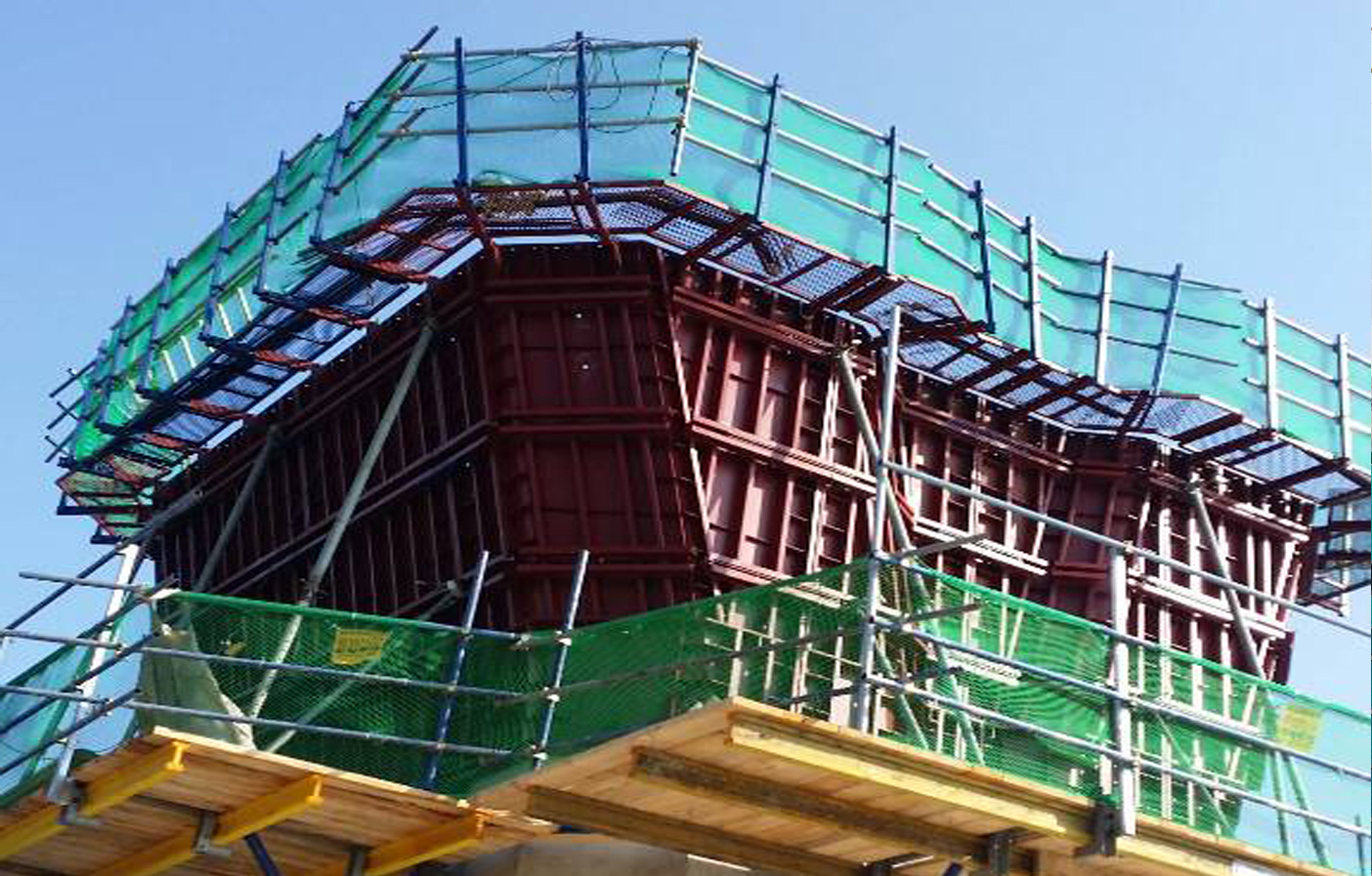 Through embedding a high load anchor, the KP 240 system is used for various building and civil structures. Furthermore, the 2.4m platform allows a safer and wider working environment for workers. By installing brackets on the external structure and connecting them with a separate travelling unit, the KP 240 will be used as a full formwork system. This system can also be used for working platform inside a pier elevator pit.